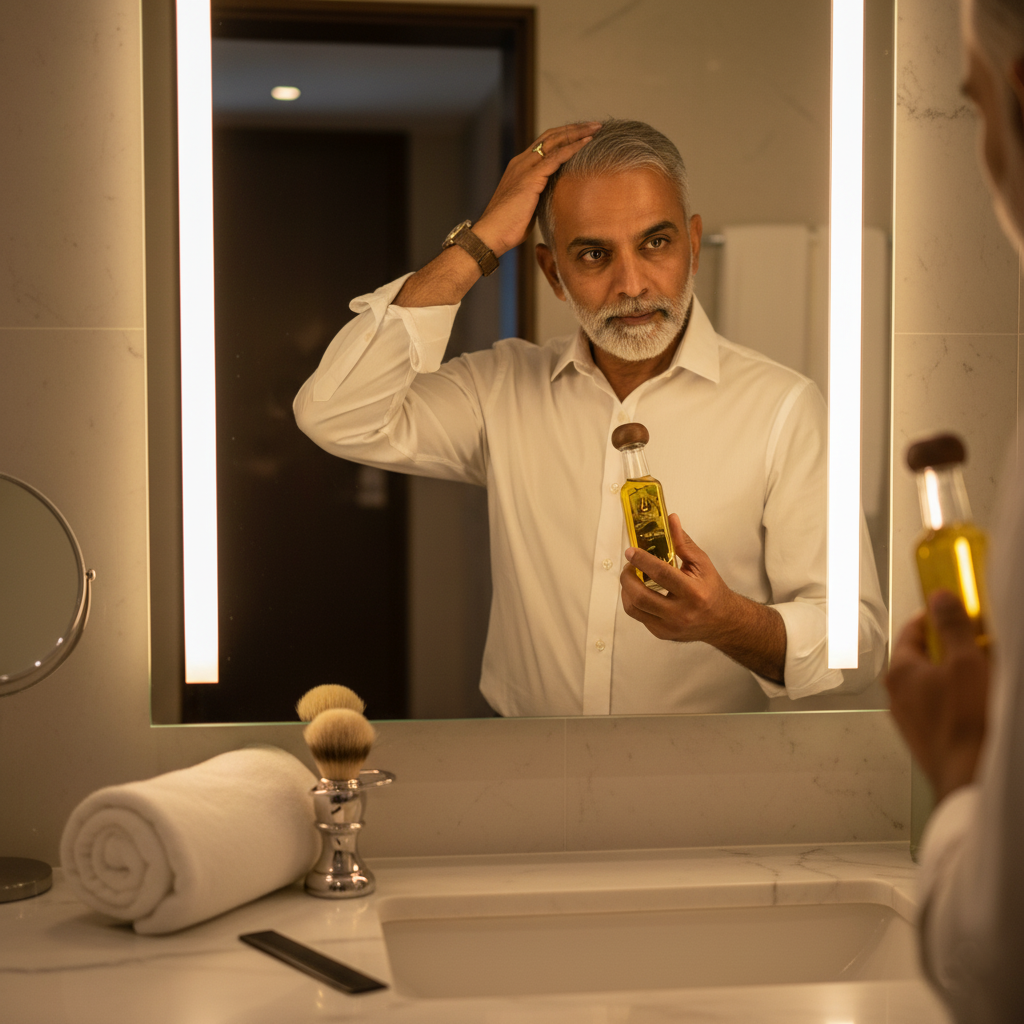 A rare formulation powered by the potent Double H Complex™, this revitalizing elixir blends cold-pressed Himalayan oils with rare herbs sourced from the Himalayas and across the globe. Specially crafted for men with grey hair, it supports graceful aging while enhancing hair vitality and confidence.